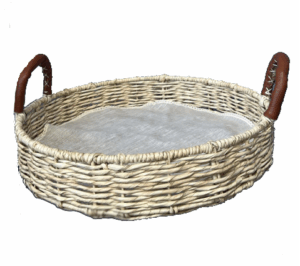 Salsera de vidrio soplado reciclado con funda de palma a la medida. Creemos que este es un producto súper versátil ya que los puedes usar para tus condimentos al centro de tu mesa o como platos individuales para tus entradas o postres.